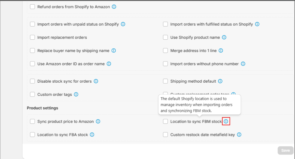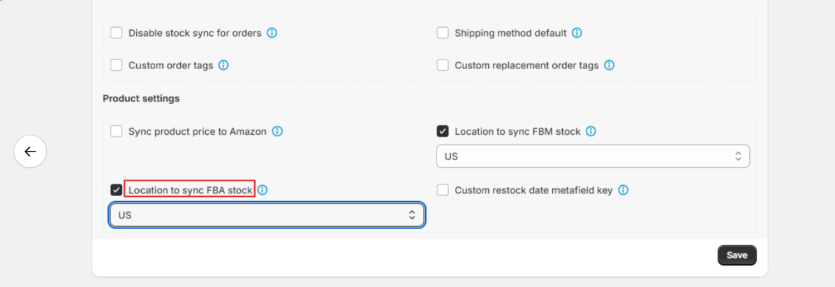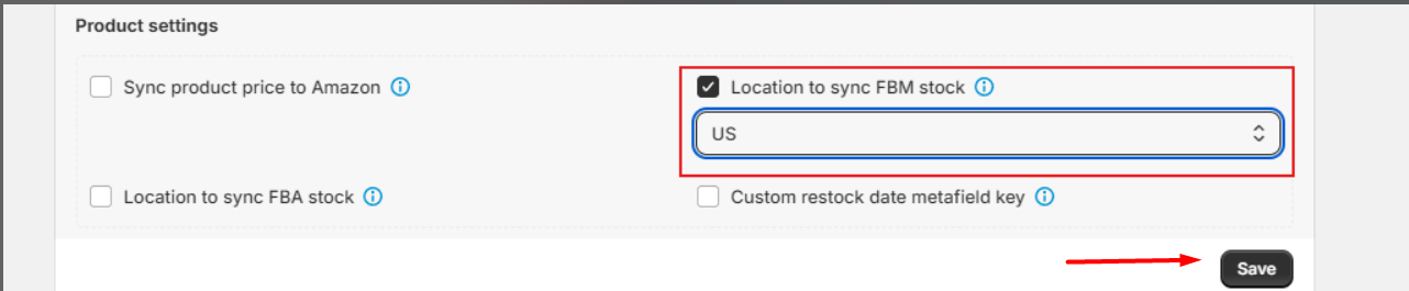 - Locate Location to sync FBA stock under Product Settings.